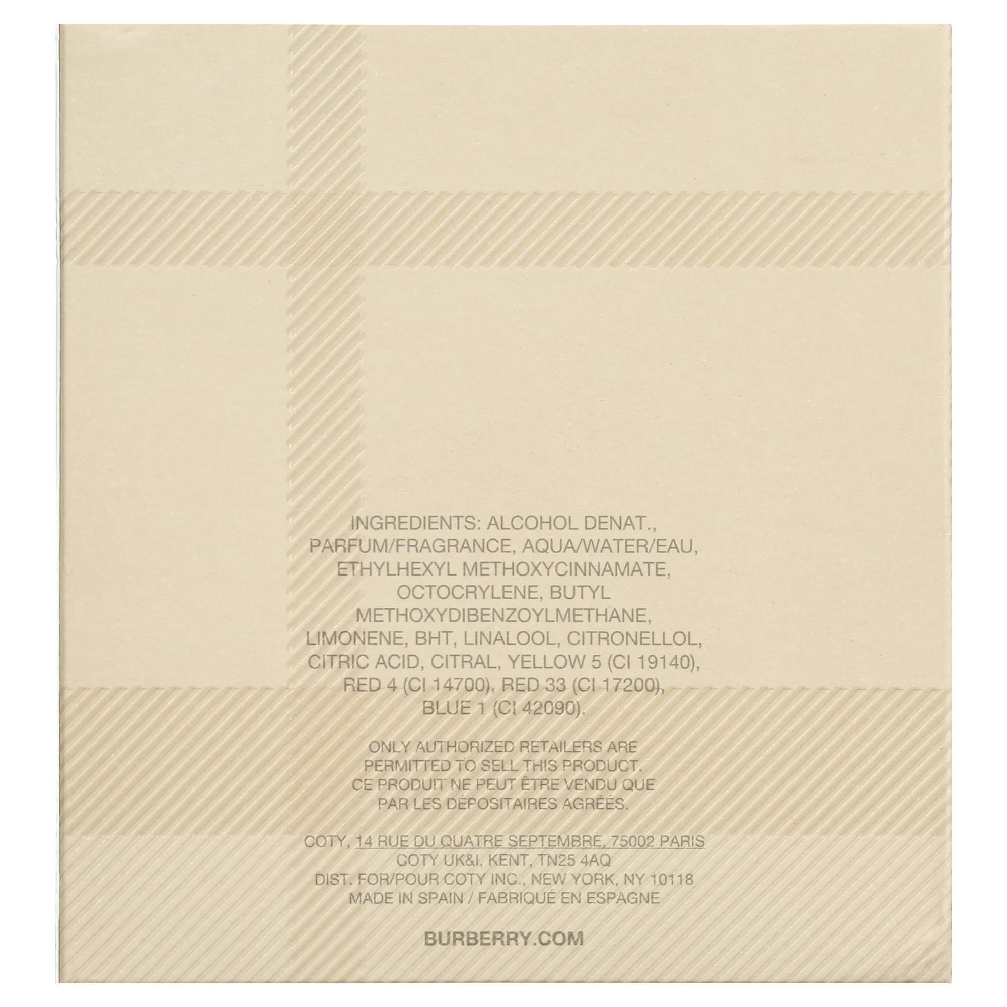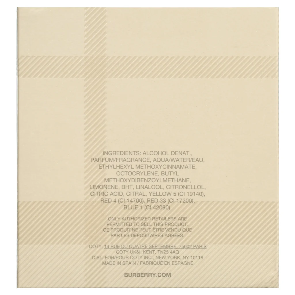 Burberry Eau de Parfum, Perfume For Women, 3.3 Oz. The Burberry woman is simple and charming, she loves the City she lives in and enjoys the long walks in the streets of London. Perfume is made in striking minimalist design. It starts with succulent and fresh burst of fruits; peach, apricot, cool pear and black currant. The heart is woody-floral; composed of clear and sharp notes of jasmine gently harmonized with the notes of sandalwood and cedar. The drydown is made of musk and vanilla. The perfume was created by Michel Almairac in 1995.
