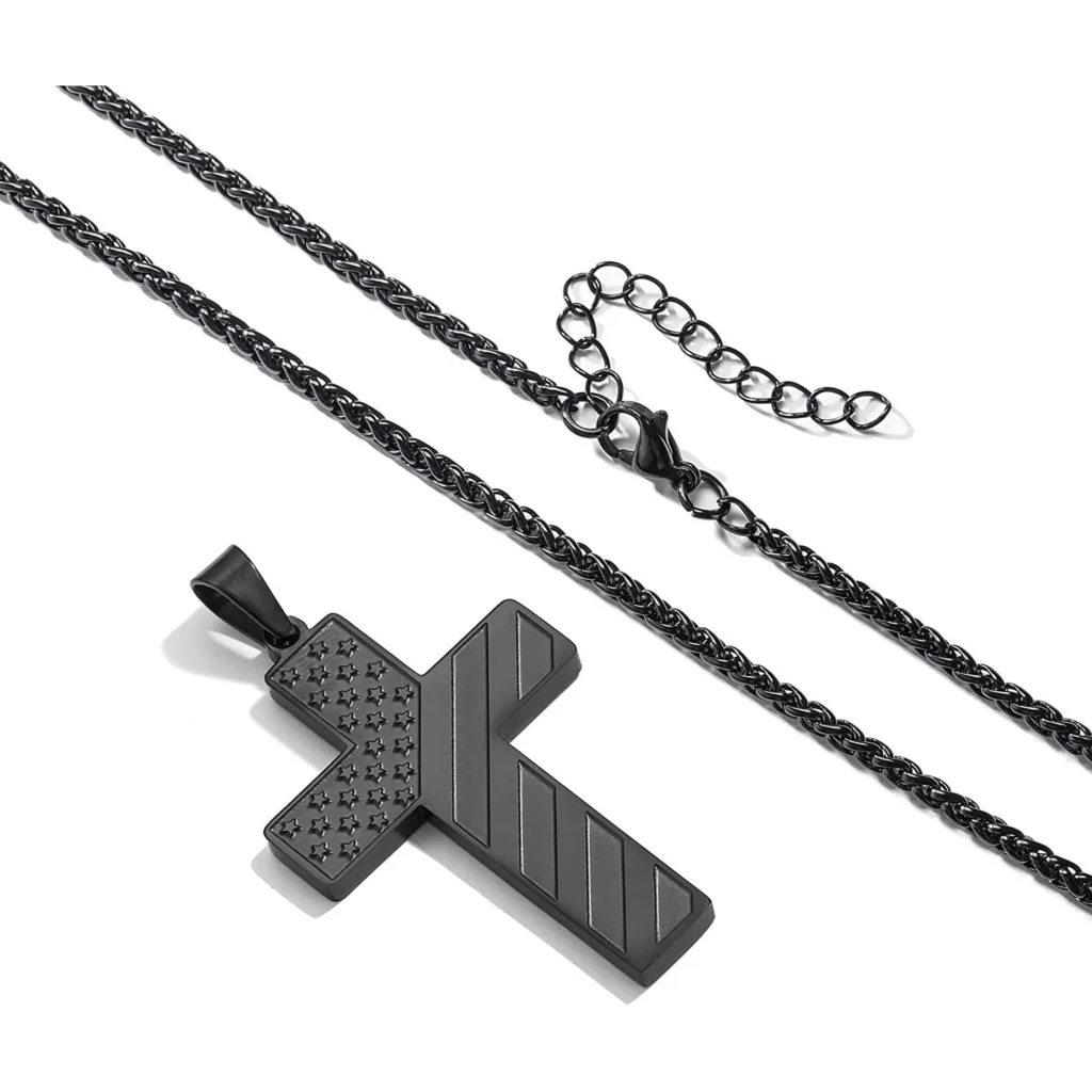- 💦【American Flag Bible Verse cross necklace】 A pendant in the shape of a cross is cut from thick steel plate and then engraved on the front with the same stars and stripes as our American flag. The shape of the cross reflects our faith in Christ and the flag design shows our American national spirit. Different cross necklaces differ from scripture necklaces.With a nice chain, it makes a very beautiful men necklace.