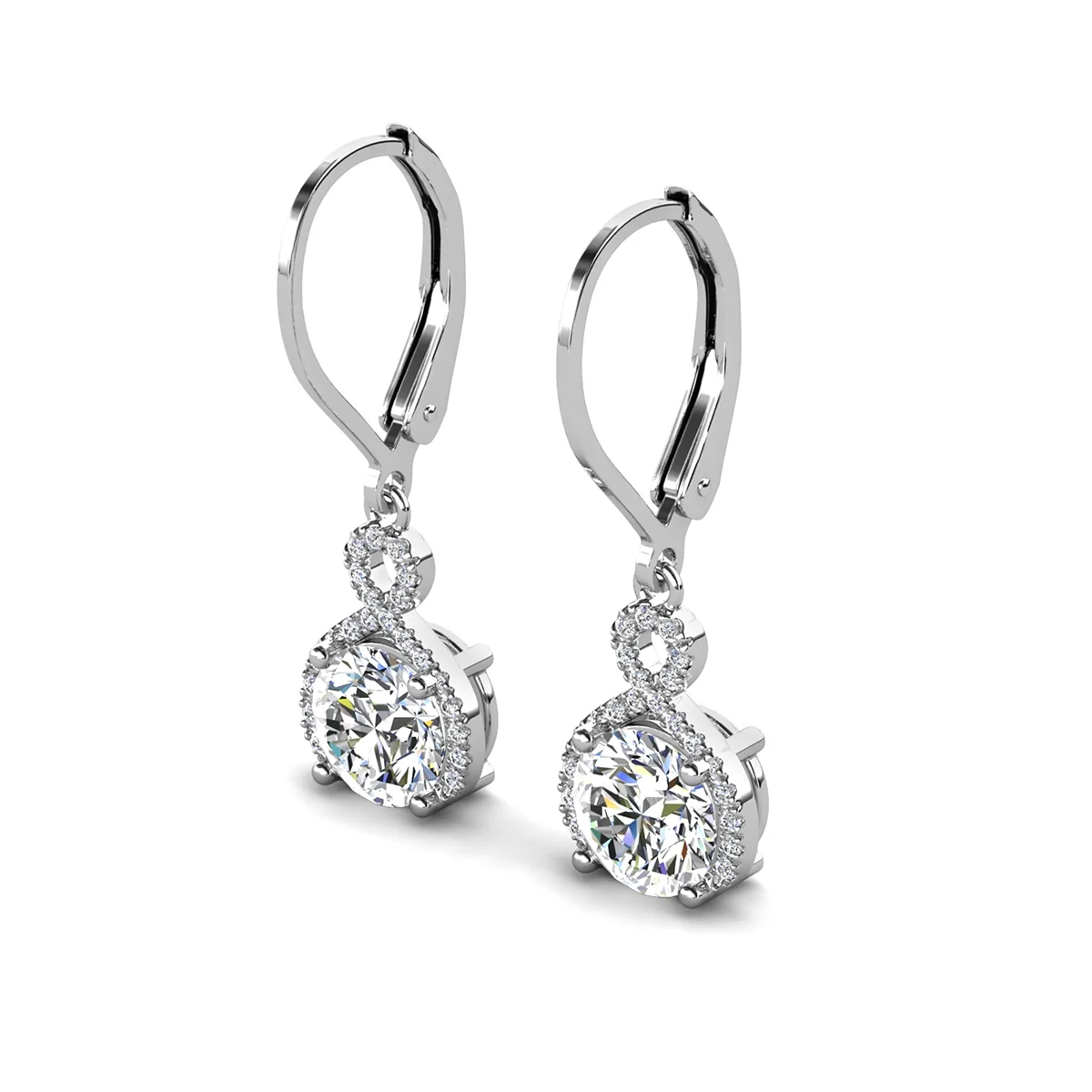 Cate & Chloe Alessandra 18k White Gold Drop Dangle Earrings with AAA+ Grade Simulated Diamond Crystals for Women. Add a touch of elegance to any outfit with the Alessandra Drop Earrings. Plated in luxurious 18k white gold, these earrings feature a beautiful halo infinity design, offering a timeless and radiant look. Adorned with AAA+ grade simulated diamond crystals, they reflect light brilliantly, providing a captivating sparkle from every angle. Perfect for daily wear or special occasions, the Alessandra Earrings bring sophistication and charm to any look. A must-have addition to your jewelry collection.