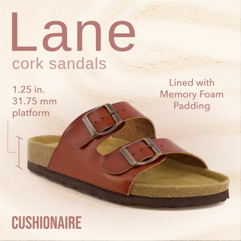 Experience ultimate comfort and timeless style with Lane, the classic cork sandal from Cushionaire. Designed with your comfort in mind, Lane features a fully cushioned genuine suede leather insole that naturally molds to the contours of your feet for a personalized fit. The cushioned heel cup offers targeted support for all-day comfort, while the adjustable straps ensure the perfect fit for every foot. Crafted with an extremely soft vegan upper, Lane provides a luxurious feel that keeps your feet happy from morning to night. The flexible cork footbed, combined with a durable traction design EVA outsole, delivers exceptional flexibility, support, and long-lasting wear. Whether you’re strolling the boardwalk, running errands, or relaxing at home, Lane is your go-to sandal for versatile comfort and effortless style.
