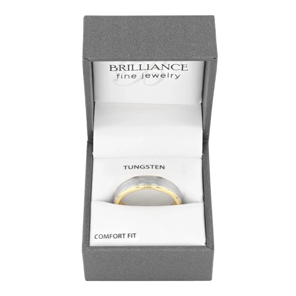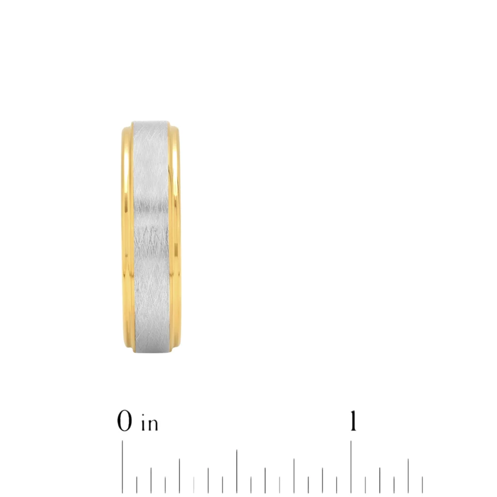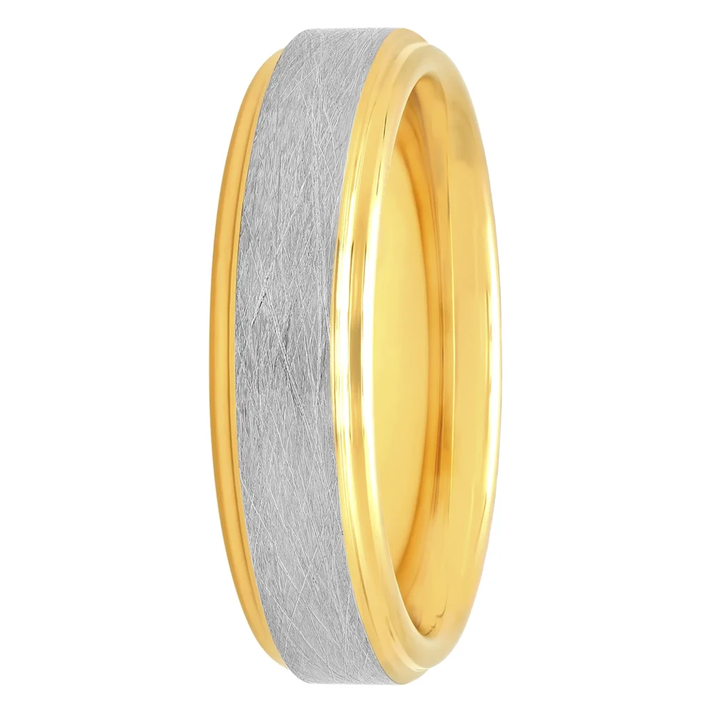 Maintain your fashion style with our Men’s Tungsten 6mm Satin and High Polish Wedding Band. It features a beautiful two-tone white and yellow finish domed comfort-fit band with step edges, with timeless details refined to perfection. The center band is complete with a unique satin finish that brings a subtle glow to the eye. The curved, comfort-fit inner band is high polish and makes a perfect ensemble to any special occasion attire. Wear this wedding band confidently as it is scratch and tarnish resistant. This six-millimeter tungsten band offers satin and high-polish finishes. Ideal choice for any occasion, whether that’s for a night out or a regular day at work, you can wear this with joy and confidence.