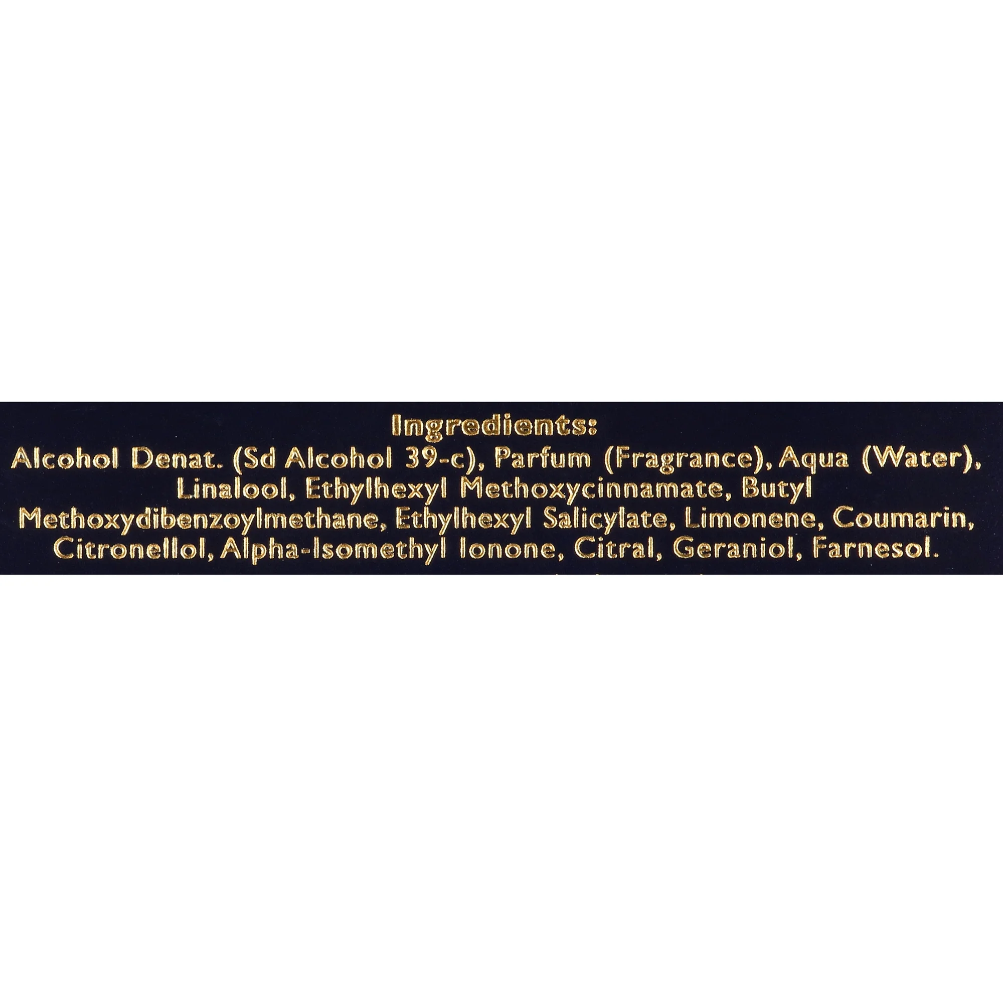 Alcohol Denat, (Sd Alcohol 39-c), Parfum (Fragrance), Aqua (Water), Limonene, Linalool, Coumarin, Alpha-isometry Ionone, Citral, Citronellol, Geraniol, Cinnamal, Eugenol